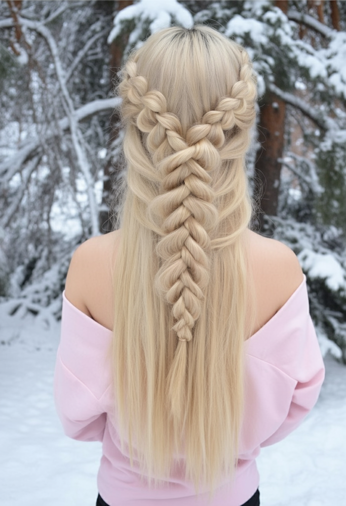This braid hairstyle forms an impressive V-shape at the back of the head, making the style seem soft and structured. The wide plaits wrap the crown then come together into one central braid, ideal for long, straight hair. It’s a whimsical and wintery elegant look, almost like a hairstyle straight from a snowy fairytale.